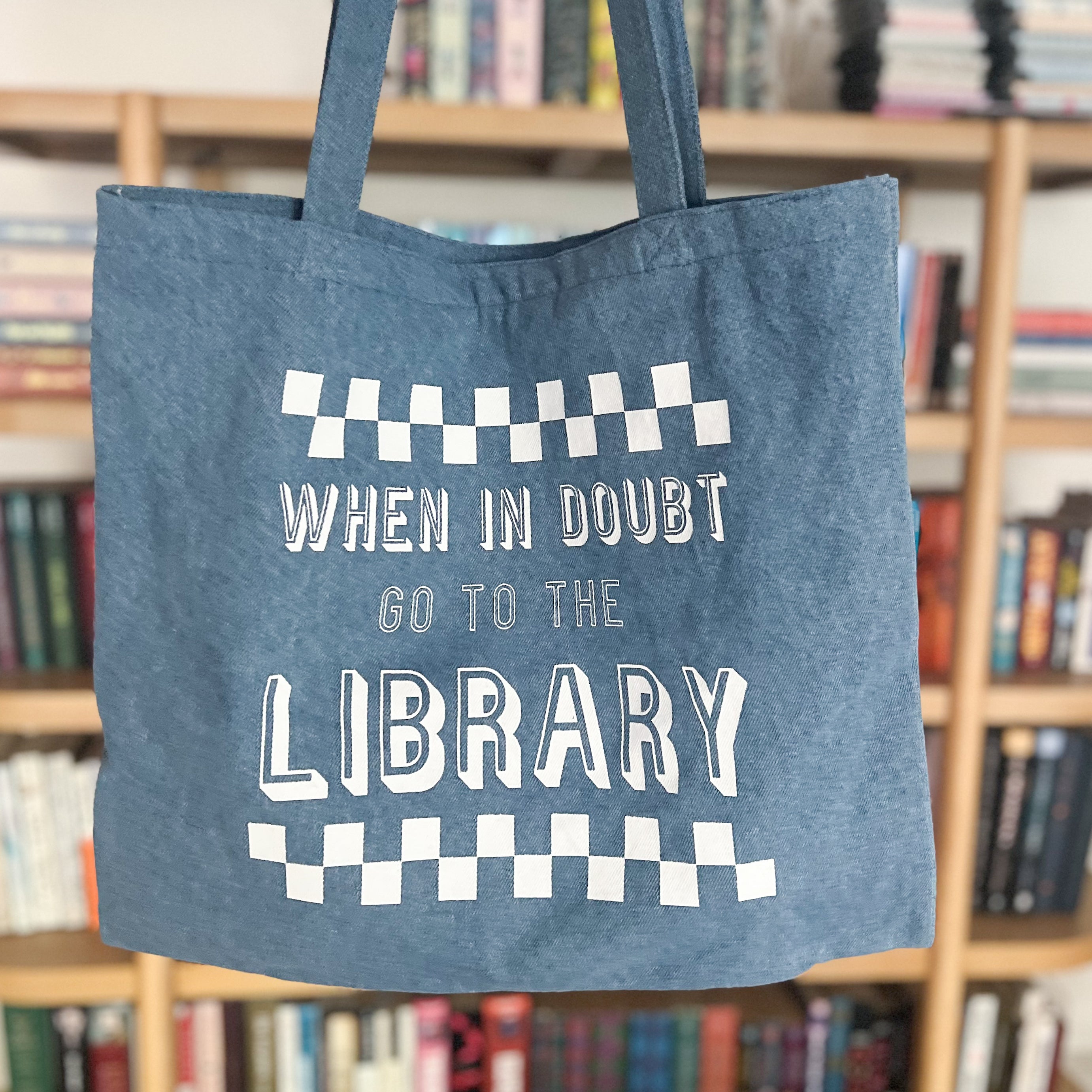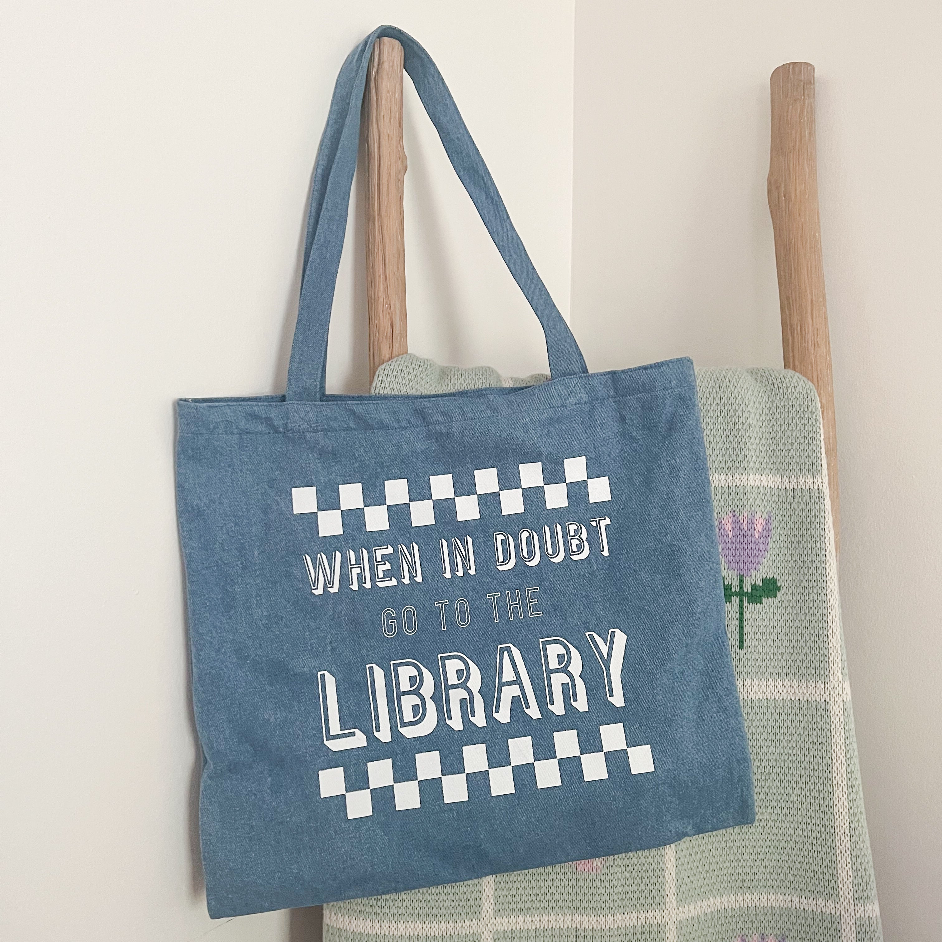 The perfect full-size book tote, but make it denim. Printed with the quote "when in doubt, go to the library" inspired by Harry Potter. This tote is great for any season and made of high quality denim to last for years.