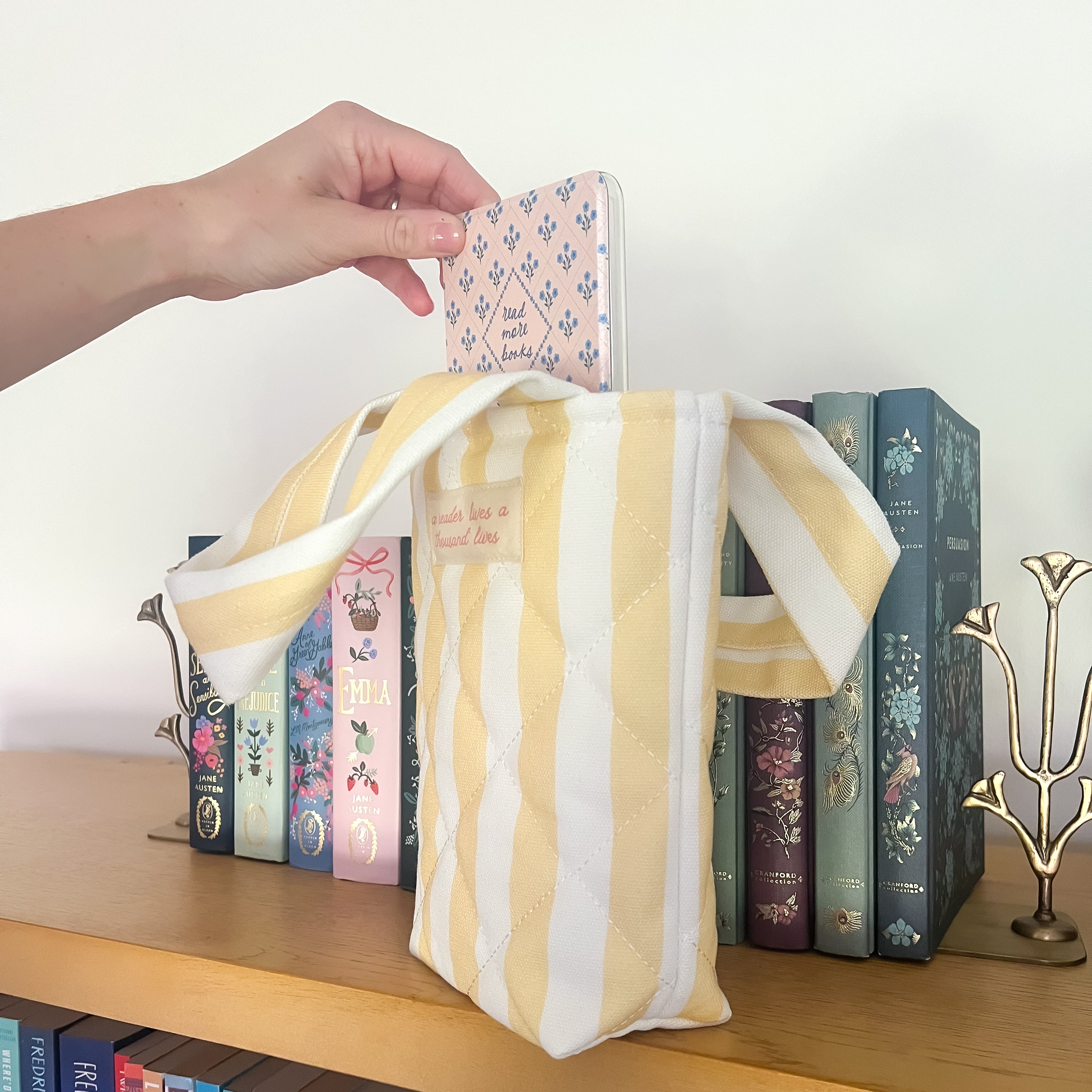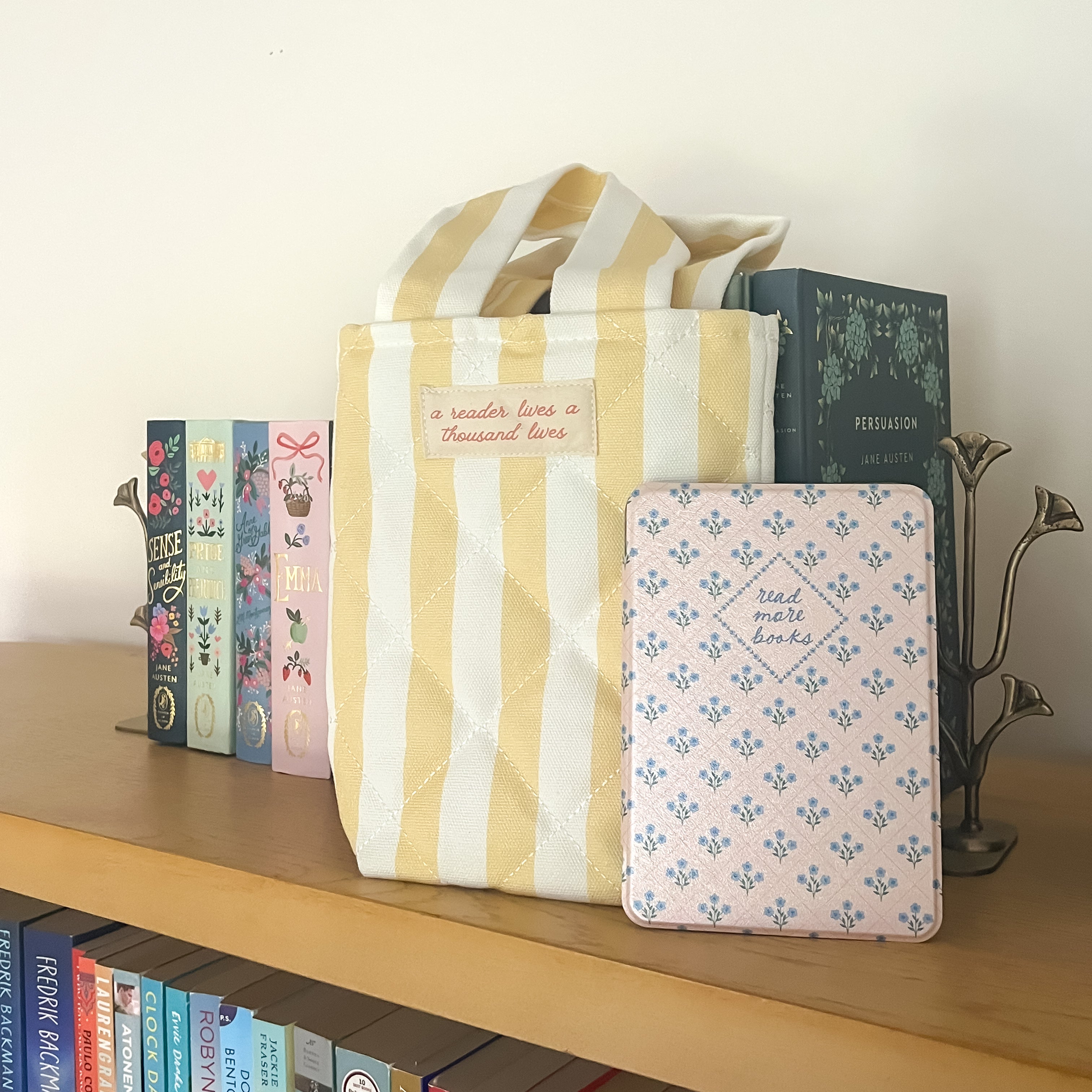 The perfect kindle tote is here! Bring your e-reader with you everywhere mini cabana tote! Featuring the quote "a reader lives a thousand lives" from A Dance With Dragons by George R. R. Martin.